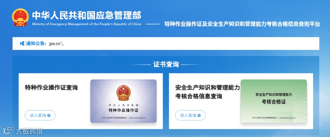 中华人民共和国应急管理部官网——特种作业操作证及安全生产知识和管理能力考核合格信息查询平台