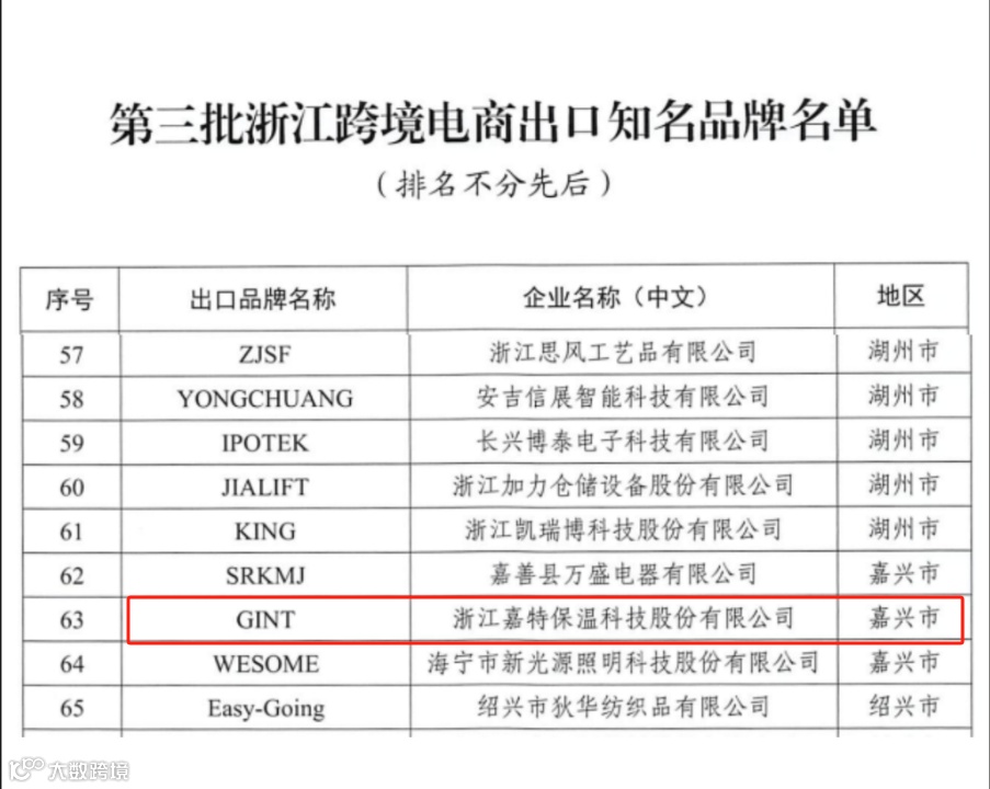 近日,浙江省商务厅公布了2023年度浙江跨境电商出口知名品牌名单,我市浙江嘉特保温科技股份有限公司品牌“GINT”成功上榜,获评省级跨境电商出口知名品牌。