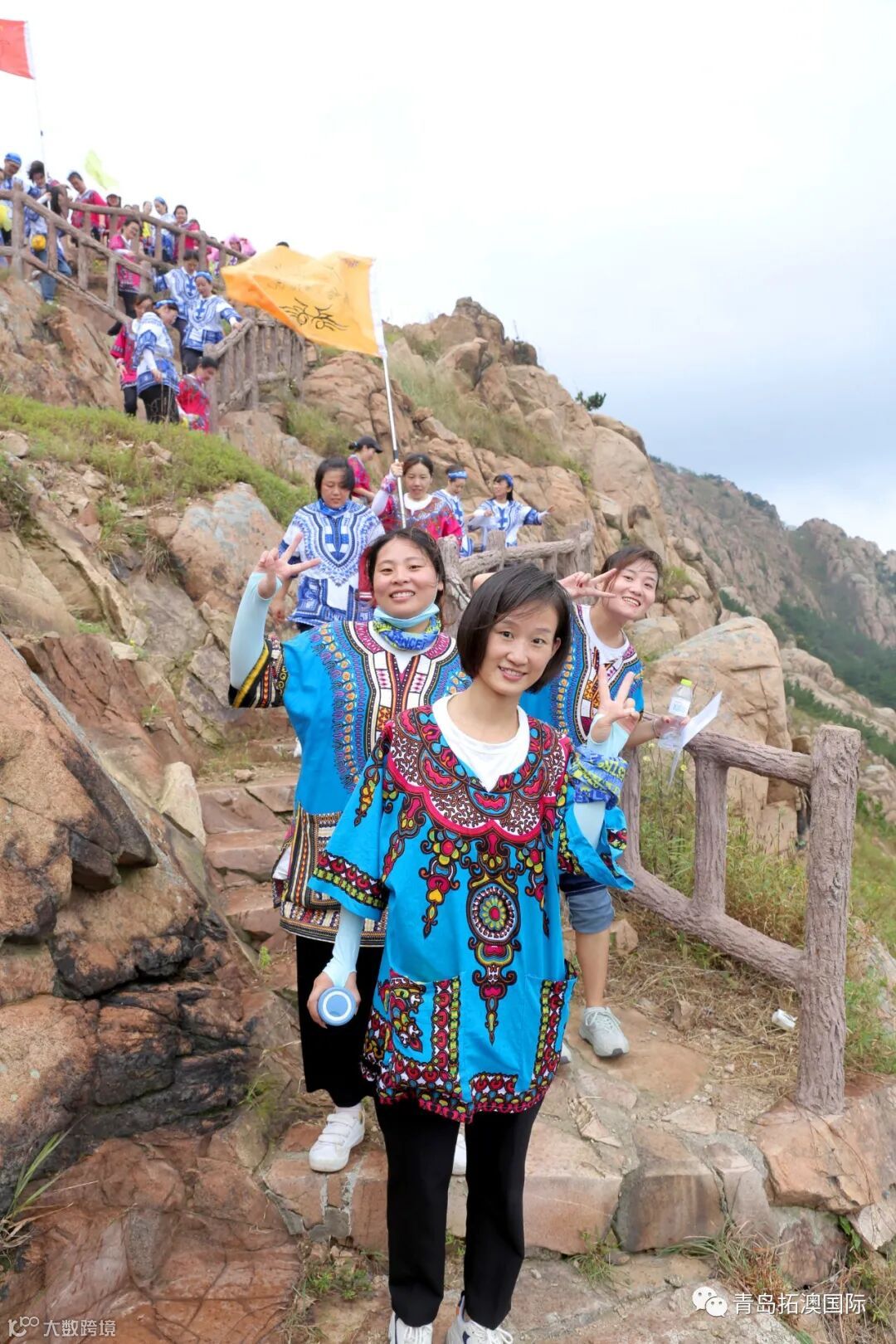 登山路上雨相伴,各种造型都很嗨,团队作业同携手,上山下山都不难。