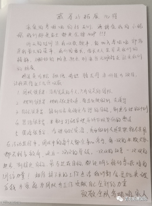通过这次拓展,让我更加明白我们是一个整体。遇到问题我们要及时沟通、及时解决。每个人都要扮演好自己的角色,做好自己的工作。听从上级安排,配合好队友的工作。我们是同进退的整体,即使有失败,也不要气馁,找出原因,解决问题,重装旗鼓,继续前行……。最后很荣幸加入我们这个积极向上、快乐、有正能量的大家庭!通过这次拓展我收获颇丰,感受很多,又成长了很多……,感恩遇见……