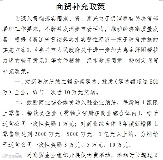 政策体系持续完善。先后出台了阶段性消费激励政策、电动自行车经销企业零售奖励政策和商贸补充政策,政策内容涵盖引导企业经营稳步增长、推动电商和主辅分离企业纳统、鼓励商贸企业举办消费活动等多方面。