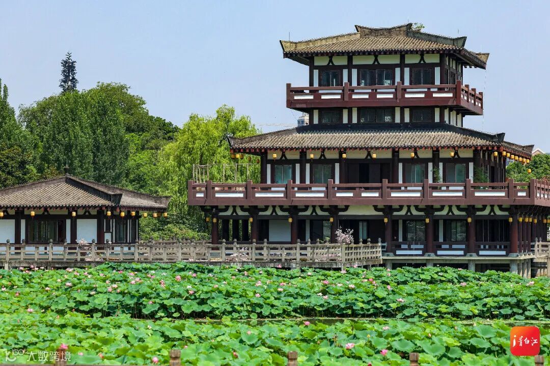 荷花与古色古香的亭台水榭相映成趣