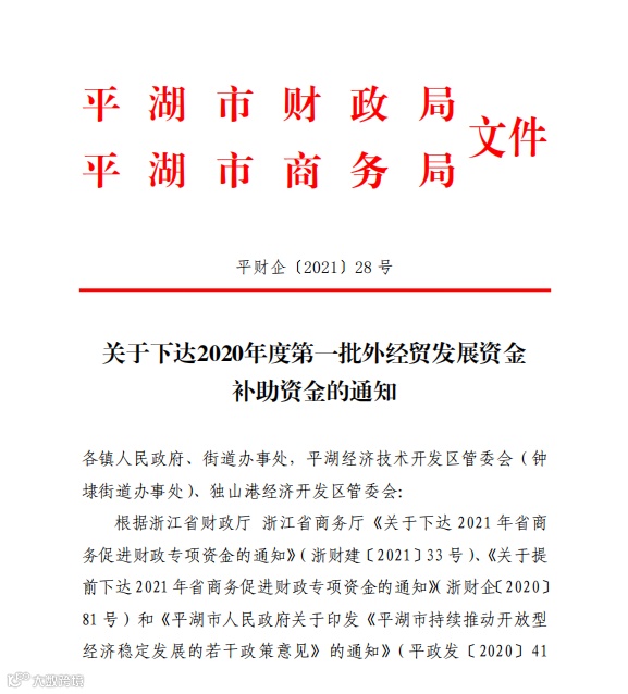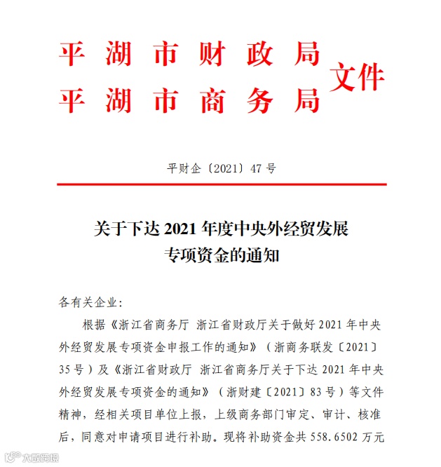 宣讲落实上级稳外贸政策和平湖市稳定外贸发展系列政策意见,同时梳理研究各级出台的外贸惠企政策,结合我市实际,谋划制定贸易数字化营销、跨境电商、内外贸融合发展等方面的新鼓励政策。对数字化改革应用场景建设、电商进农村示范项目建设给予追加配套,力保外贸政策的连续性、稳定性和灵活性。2021年共兑付各级商务促进资金5396万元,其中中央资金558万元,省级资金1778万元,市级资金3060万元。