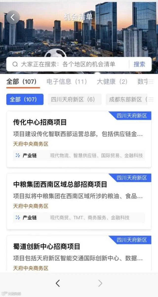 扫码进入“蓉e投”界面,左右滑动最上面一行图标,可以看到“数字画像”“载体空间”“科创平台”“产业政策”等8个栏目。点击进入“机会清单”,可以看到107个项目。同时该栏目对项目类型以及区域进行了分类,包括电子信息、大健康、数字经济等。另外,各区(市)县具体有多少、有哪些项目都可以点击其中的子栏目查询。
