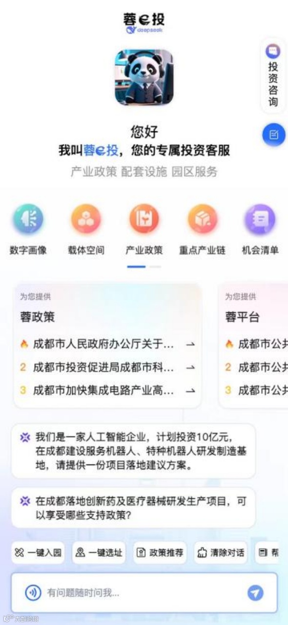 “蓉e投”平台的上线,是成都持续优化营商环境、搭建常态化政企交流机制的新探索,开启了成都以人工智能赋能招商引资,加速构建“数据驱动决策、算法优化路径、智能提升服务”新型招商体系的新征程。