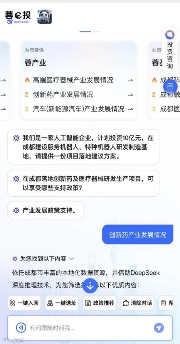 左右滑动界面中间的“为您提供”栏目,可以看到“蓉政策”“蓉平台”“蓉产业”“蓉基金”四个栏目,每个栏目下方列举了3个相关热点问题,点击即可获得相关信息。像“蓉产业”下方有“高端医疗器械产业发展情况”“创新药产业发展情况”“汽车(新能源汽车)产业发展情况”3个问题。