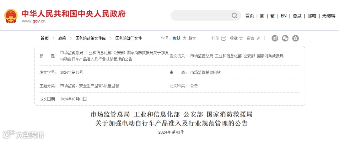 GB 42295—2022《电动自行车电气安全要求》第1号修改单、GB 42296—2022《电动自行车用充电器安全技术要求》第1号修改单、GB 43854—2024《电动自行车用锂离子蓄电池安全技术规范》将于2024年11月1日起实施。根据《中华人民共和国标准化法》第二十五条规定,自2024年11月1日起,不符合GB 42295—2022《电动自行车电气安全要求》及第1号修改单要求的电动自行车、装配充电器不符合GB 42296—2022《电动自行车用充电器安全技术要求》及第1号修改单的电动自行车、装配锂离子蓄电池不符合GB 43854—2024《电动自行车用锂离子蓄电池安全技术规范》的电动自行车不得生产、销售、进口。