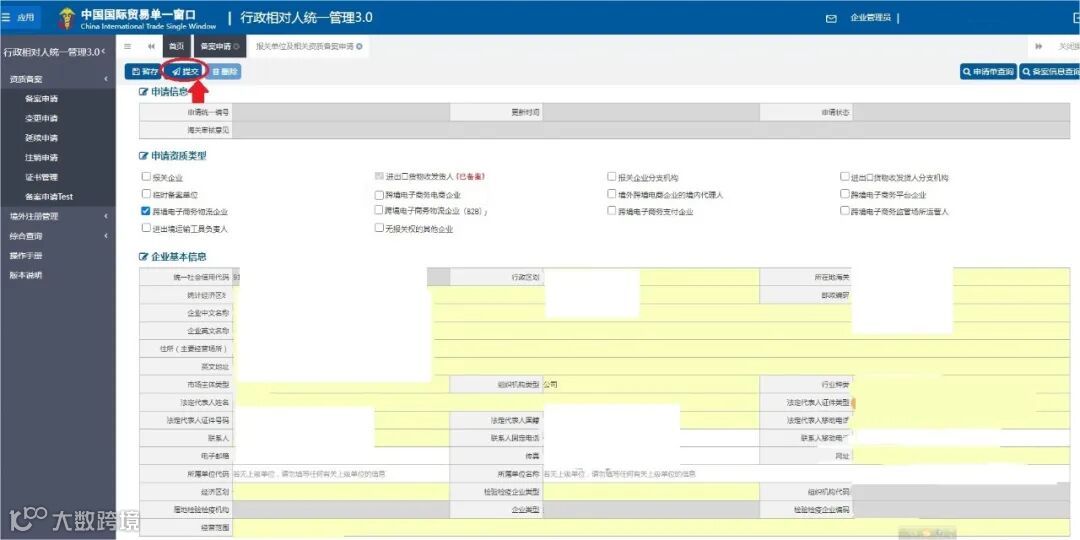 跳转新页面,选中申请资质类型为跨境电子商务物流企业,并准确填写有关信息后,点击提交即进入海关审核环节。