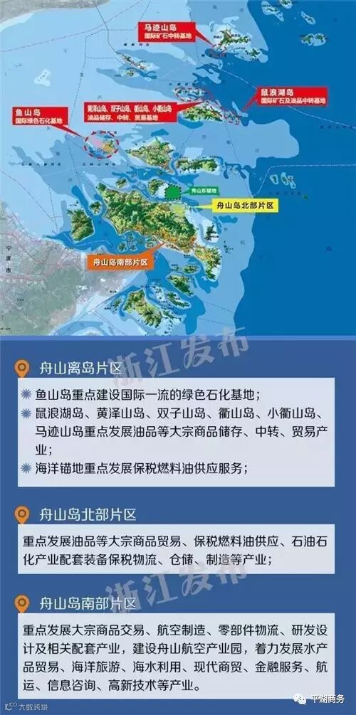 按区域布局划分,舟山离岛片区鱼山岛重点建设国际一流的绿色石化基地,鼠浪湖岛、黄泽山岛、双子山岛、衢山岛、小衢山岛、马迹山岛重点发展油品等大宗商品储存、中转、贸易产业,海洋锚地重点发展保税燃料油供应服务;舟山岛北部片区重点发展油品等大宗商品贸易、保税燃料油供应、石油石化产业配套装备保税物流、仓储、制造等产业;舟山岛南部片区重点发展大宗商品交易、航空制造、零部件物流、研发设计及相关配套产业,建设舟山航空产业园,着力发展水产品贸易、海洋旅游、海水利用、现代商贸、金融服务、航运、信息咨询、高新技术等产业。