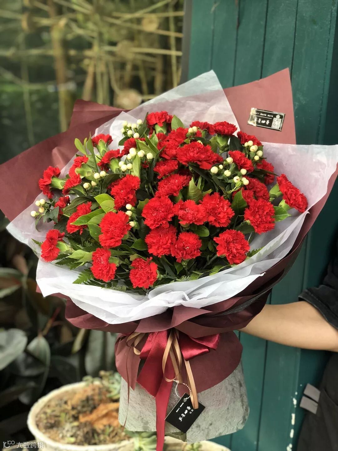 所用花材:康乃馨、火轮珠、含笑叶