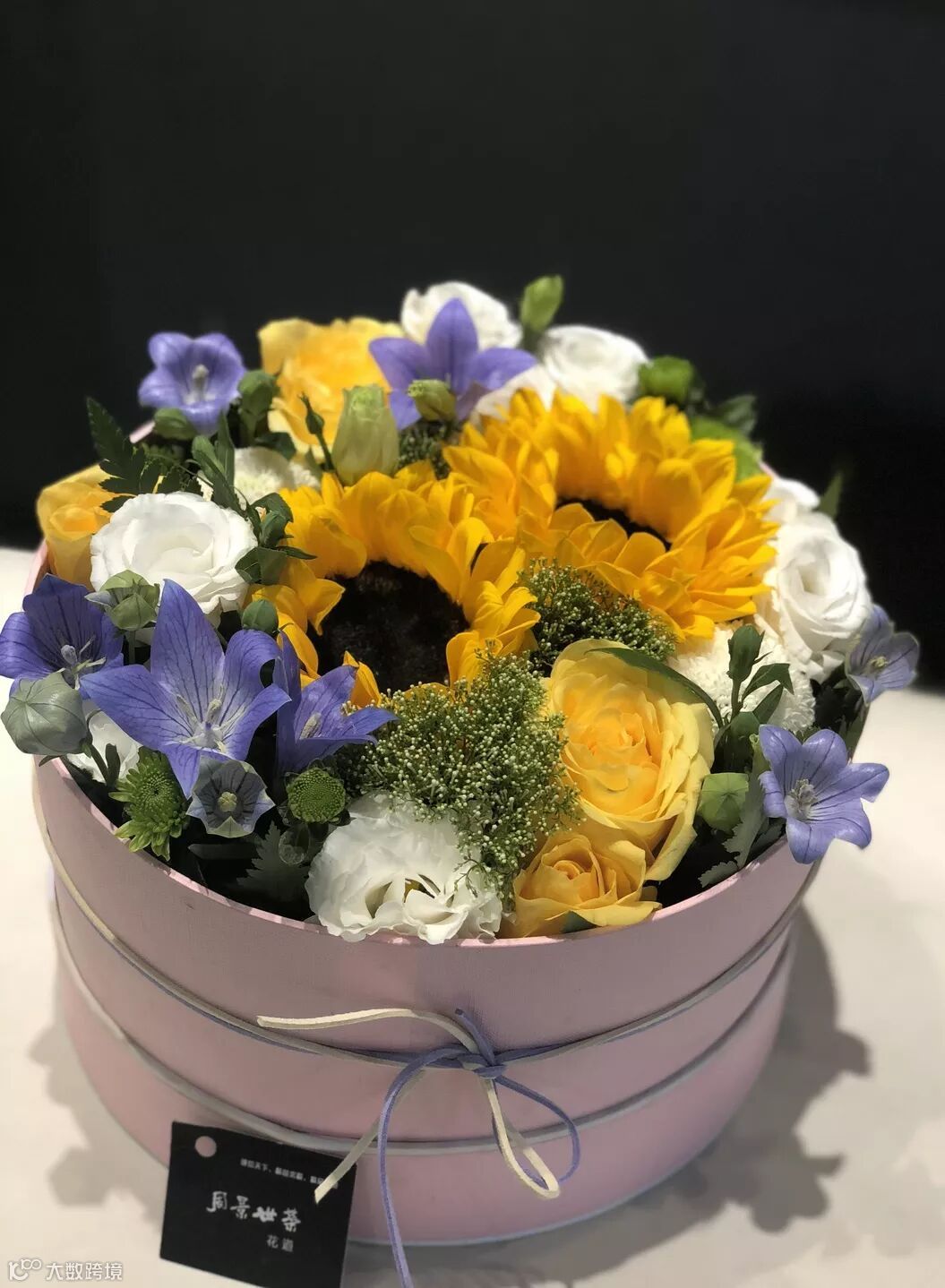 所用花材:向日葵、中国桔梗、玫瑰、配花