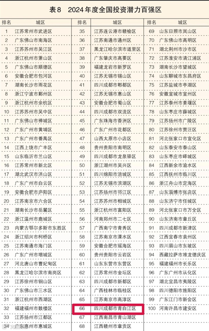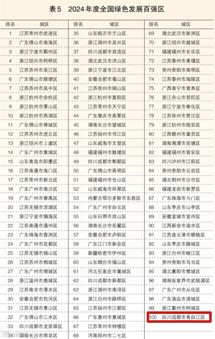 近日,中国中小城市发展指数研究课题组、国信中小城市指数研究院日前发布《2024年中国中小城市高质量发展指数研究成果》,青白江区分别上榜“2024年度全国综合实力百强区”“2024年度全国绿色发展百强区”“2024年度全国投资潜力百强区”“2024年度全国科技创新百强区”名单,这是继2019年、2023年获得四项“全国百强”后,再一次获得这些殊荣。