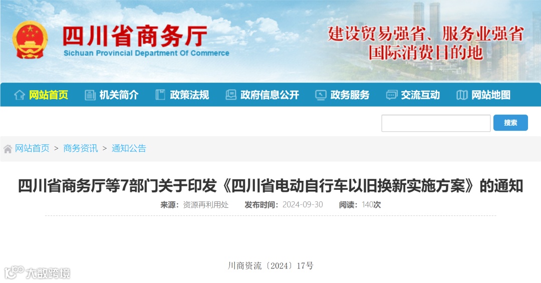 按照《商务部等5部门办公厅(室)关于印发<推动电动自行车以旧换新实施方案>的通知》(商办流通函〔2024〕396号)、《四川省人民政府办公厅关于印发<关于进一步支持大规模设备更新和消费品以旧换新的若干政策措施>的通知》(川办发〔2024〕37号)等文件有关要求,为推动全省电动自行车以旧换新工作,现将《四川省电动自行车以旧换新实施方案》印发给你们,请结合实际开展政策宣传,抓好贯彻落实。
