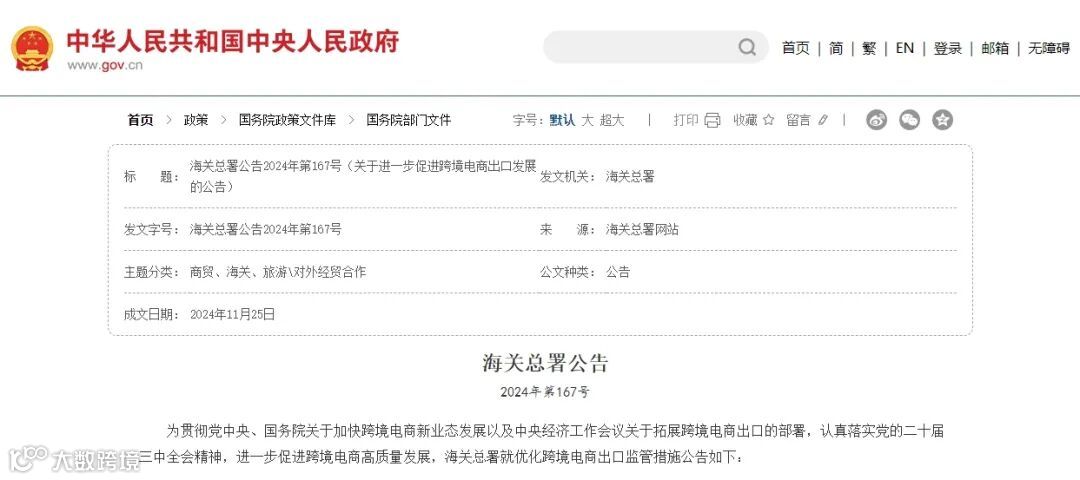 为贯彻党中央、国务院关于加快跨境电商新业态发展以及中央经济工作会议关于拓展跨境电商出口的部署,认真落实党的二十届三中全会精神,进一步促进跨境电商高质量发展,海关总署就优化跨境电商出口监管措施公告如下:
