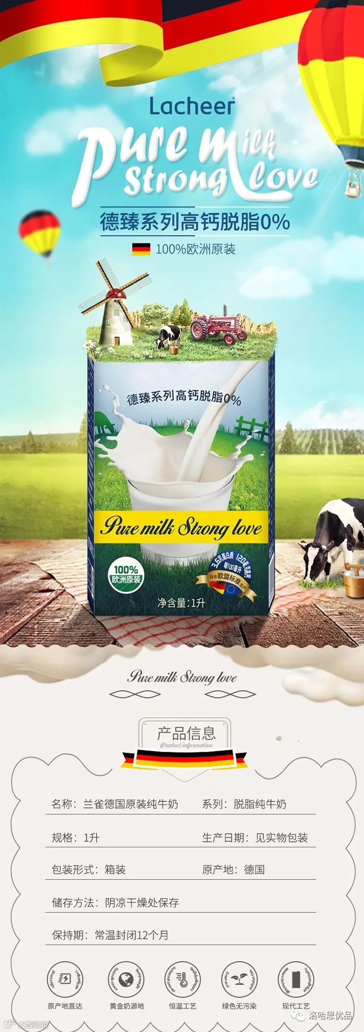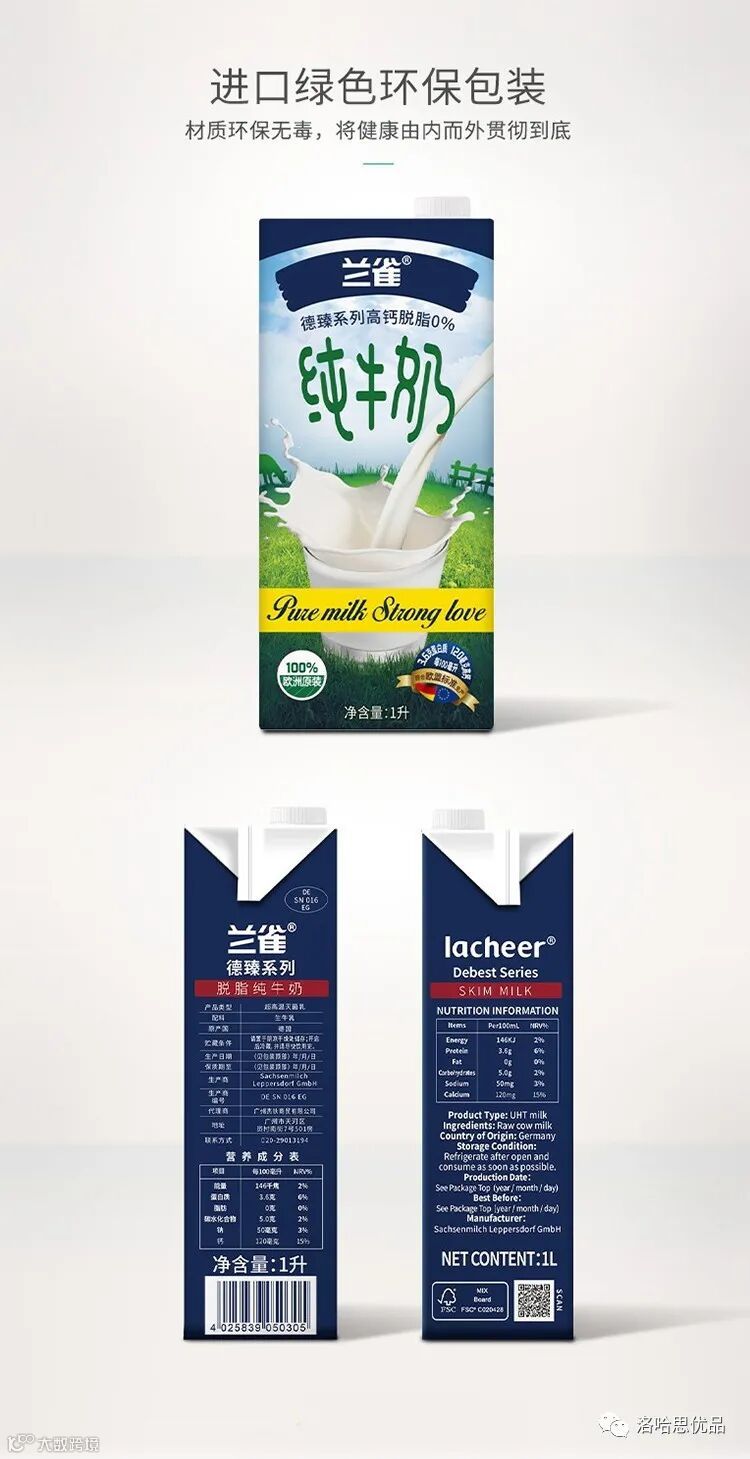 洛哈思推品丨兰雀脱脂纯牛奶1L