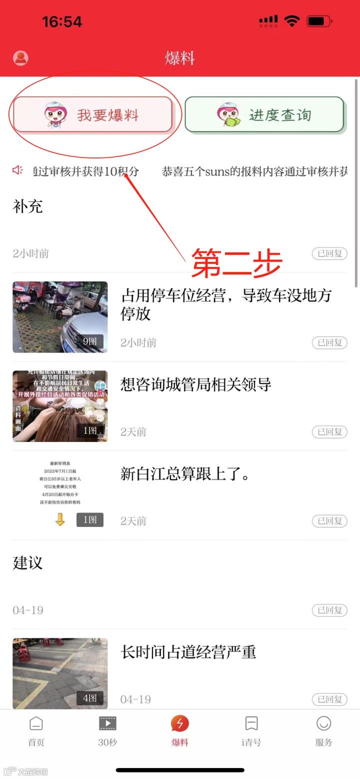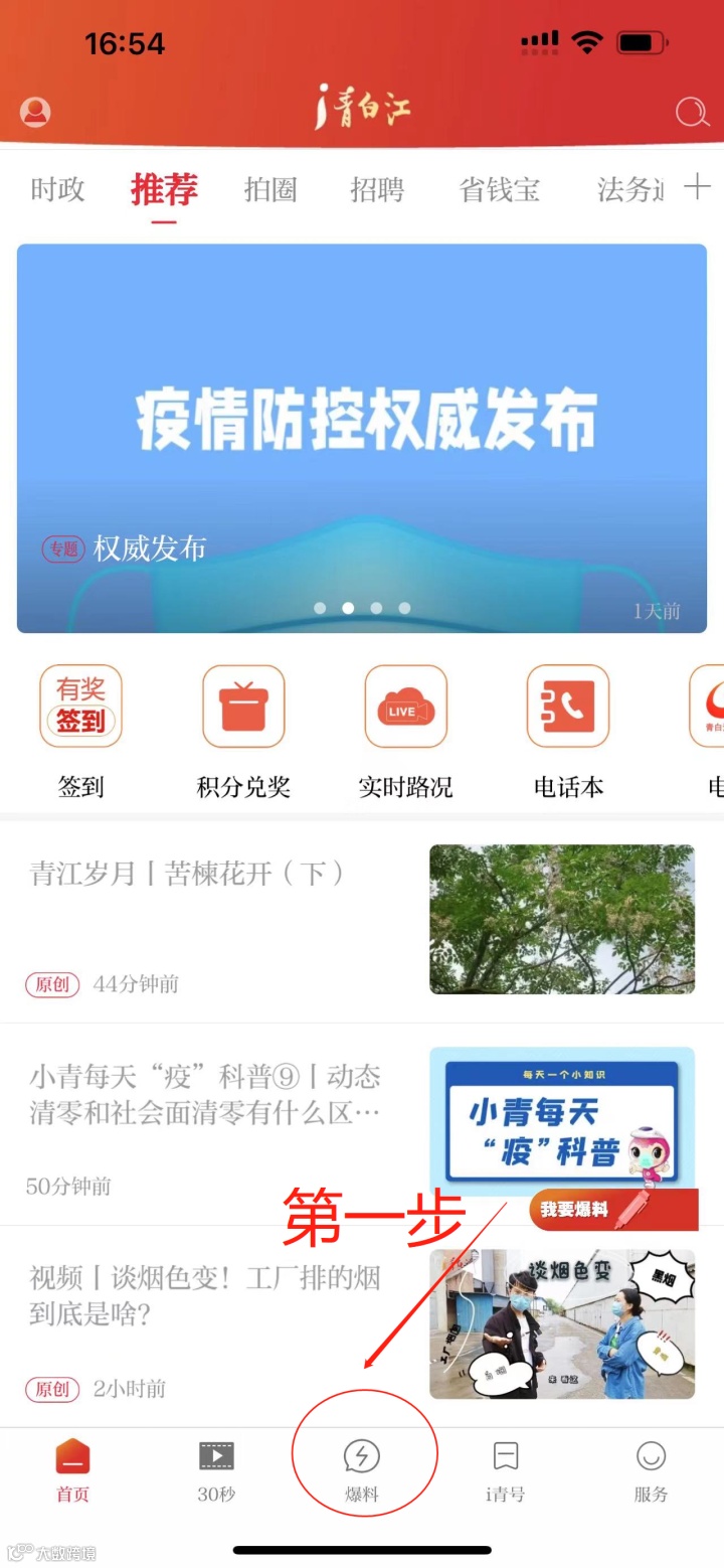 点击i青白江首页下方的“爆料”栏目
