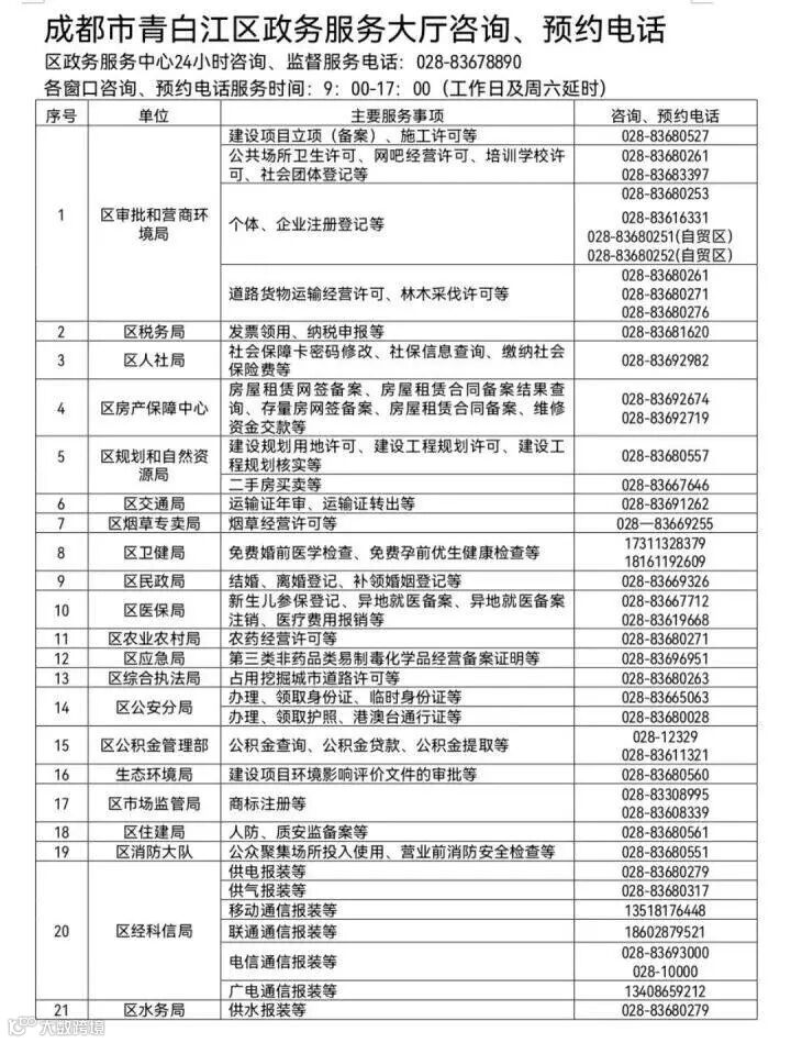 二、青白江区各镇(街道)救助服务热线(工作日9:00-12:00;13:00-17:00)