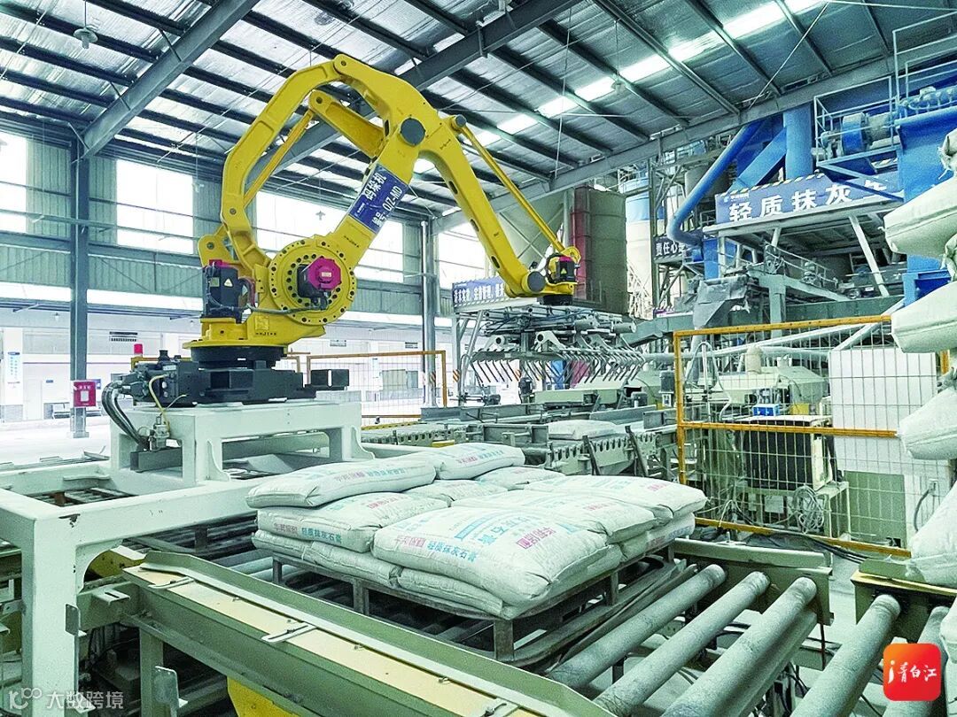 在轻质抹灰石膏生产线,每秒就产出一袋。整个生产现场干净明亮,完全没有传统建材生产现场尘土飞扬的现象。