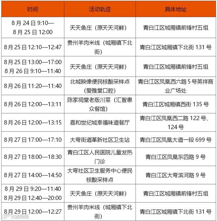 根据疫情防控需要,为了您和他人的健康,如您与以下时间和空间有重叠,请立即向社区和单位(或居住的酒店)报备,三天内接受三次核酸检测(间隔24小时),期间除核酸检测外,非必要不外出,不聚会、不聚餐,不出入公共场所,外出期间务必做好个人防护。如您出现发热、干咳、乏力、咽痛、嗅(味)觉减退、鼻塞、流涕、结膜炎、肌痛和腹泻等症状,请立即前往就近发热门诊就诊。请广大居民不信谣、不传谣,积极支持和配合疫情防控工作,如有疑问,请拨打028—68058161咨询。感谢您的配合。
