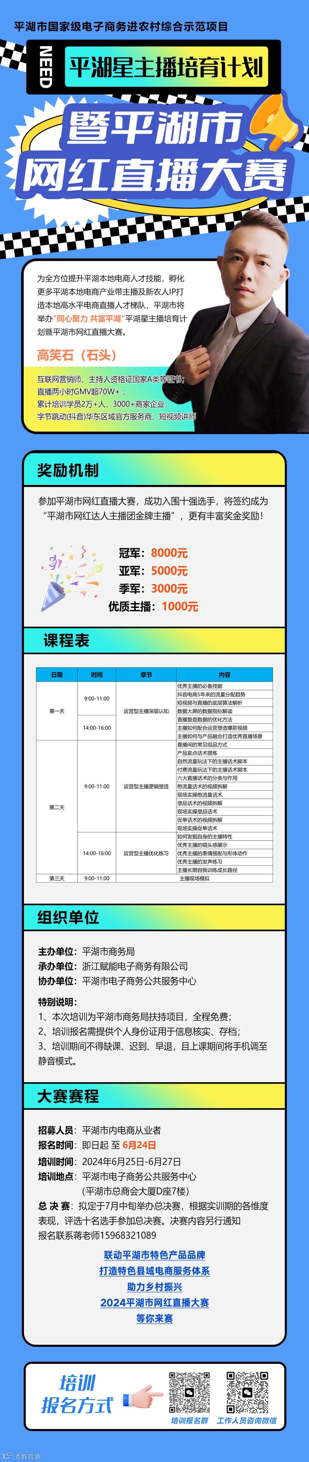 本次活动将邀请直播行业内知名品牌导师授课定制化系统培训课程,配合实训演练,以“培训+比赛”相结合模式,从认知、运营、突破三个层面,培育平湖本地优质主播队伍。十强选手,将签约成为“平湖市网红达人主播团金牌主播",还有丰厚奖金奖励,等你来赛!