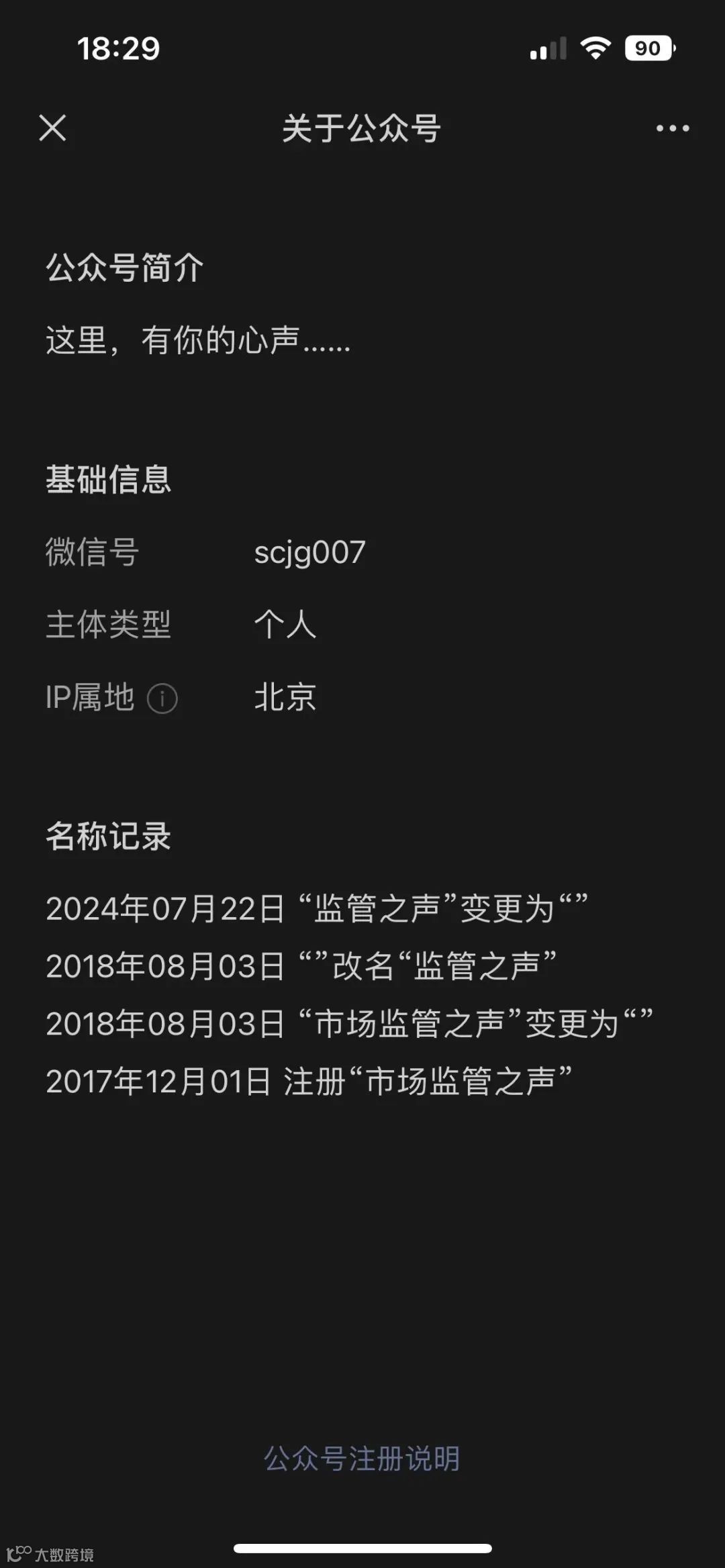 不过,记者查询发现,上述名为“监管之声”的微信公众号并无任何官方认证信息,此前多以转载发布市场监管总局部门动态信息为主。