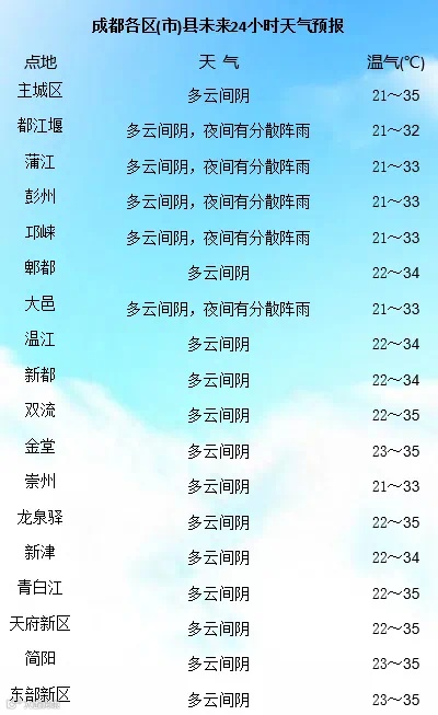 成都市气象台根据最新气象资料分析,今天白天,我市为多云天气,晴热依旧,气温21~35℃。