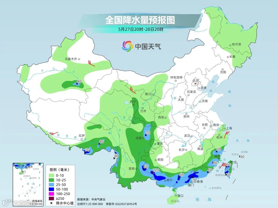 27日白天:多云间阴,夜间西部有分散阵雨,气温21~35℃
