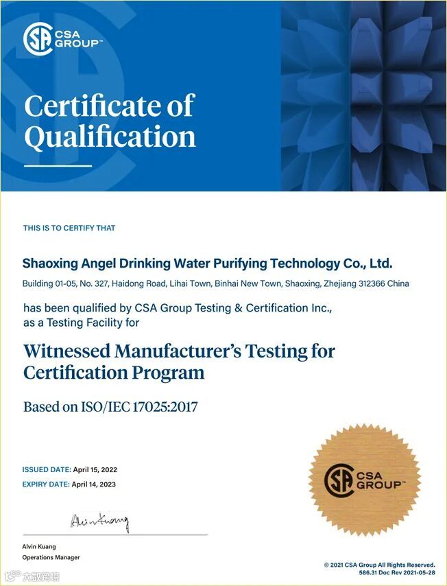 导读:绍兴市安吉尔净饮水科技有限公司检测实验室荣获北美CSA认证机构颁发的安规目击实验室授权