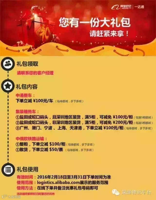 有效时间:2016年2月18日至3月31日在一达通物流平台下单时间为准使用限制:仅限使用一达通单证报关服务使用范围:logistics.alibaba.com展示的服务范围使用方法:在线下单并备注优惠礼包号码即可