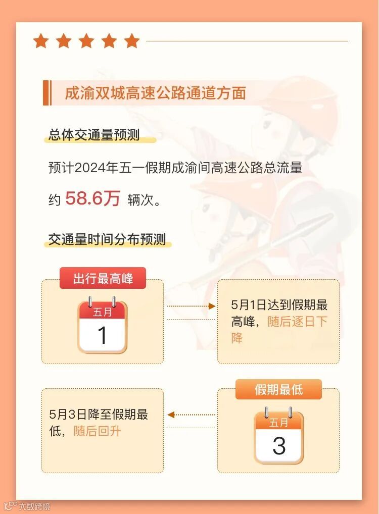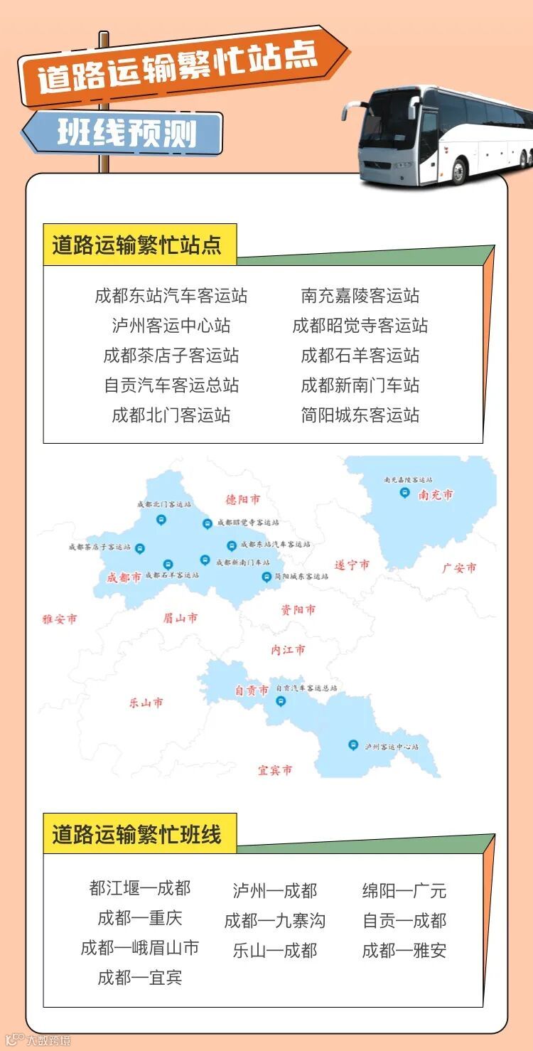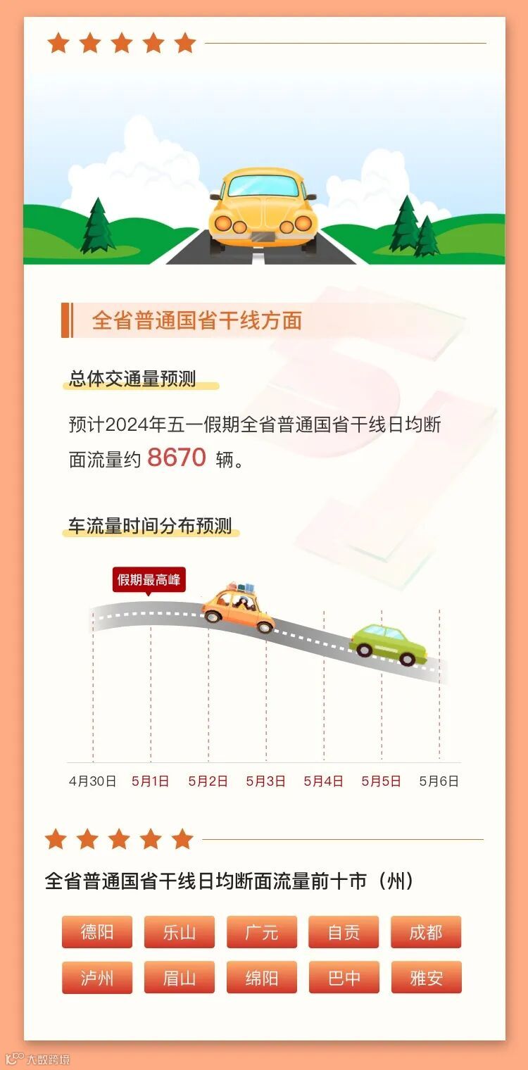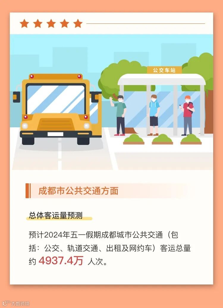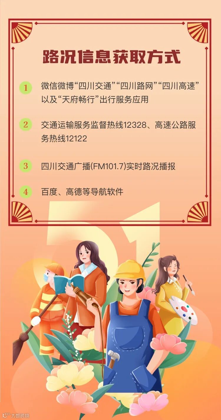 小布从成都市公安局交管局获悉,预计4月30日,假期前一天,成都晚高峰车流与假期去程车流集中交织出行,14:00-21:00为出行高峰期;5月1日假期第一天去程车辆集中出行,9:00-12:00为出行高峰期;5月4日、5日返程期,成都外围高速公路交通压力较大,城区预计交通总体平稳。