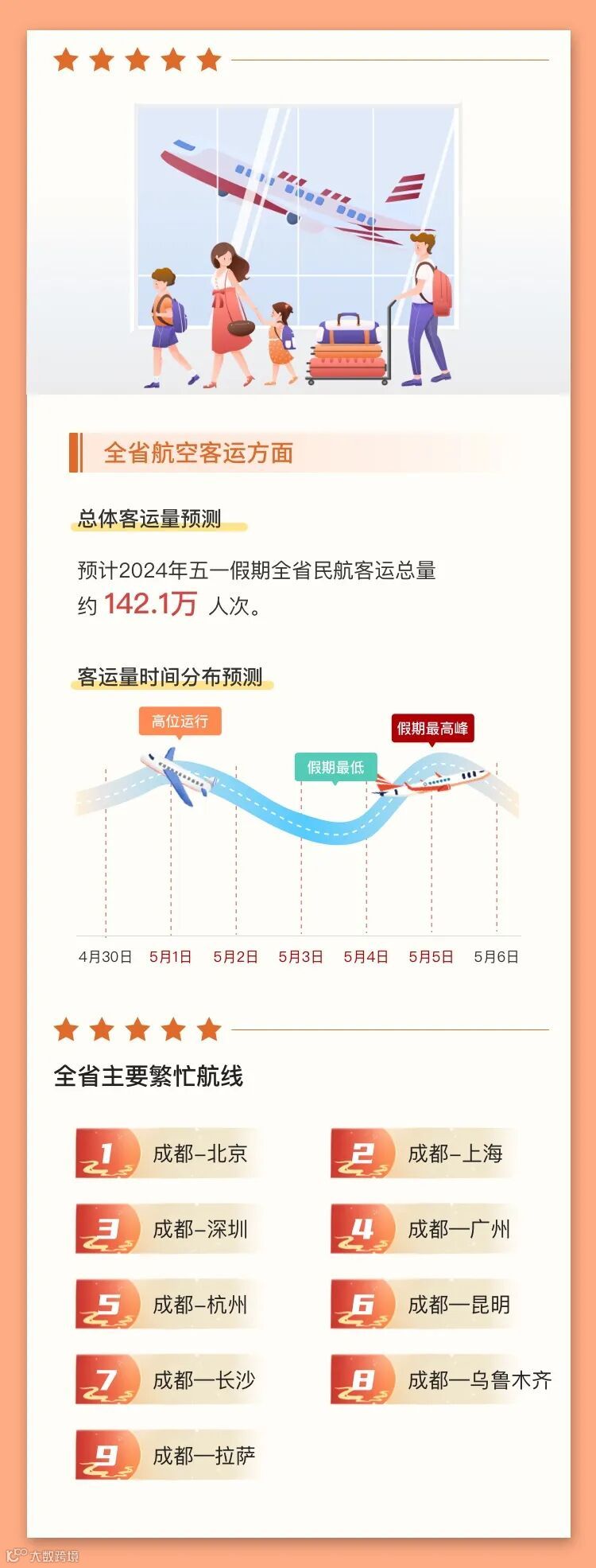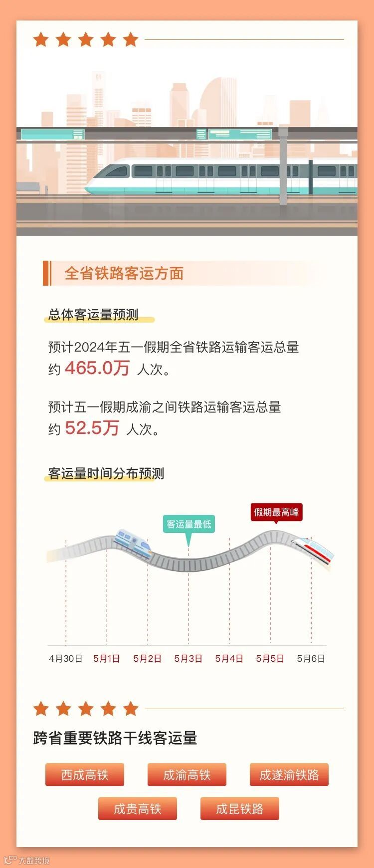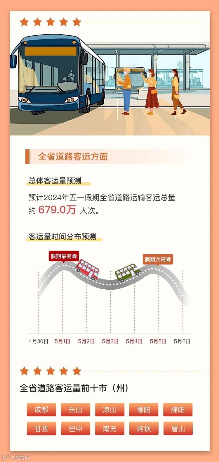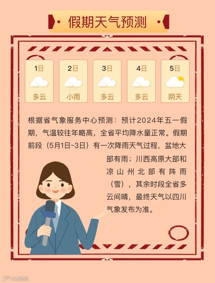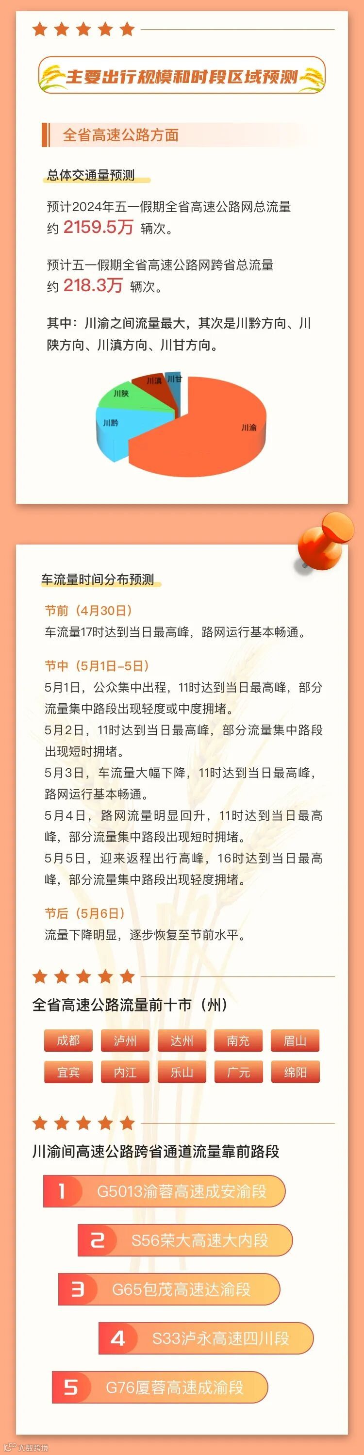 小布从成都市公安局交管局获悉,预计4月30日,假期前一天,成都晚高峰车流与假期去程车流集中交织出行,14:00-21:00为出行高峰期;5月1日假期第一天去程车辆集中出行,9:00-12:00为出行高峰期;5月4日、5日返程期,成都外围高速公路交通压力较大,城区预计交通总体平稳。