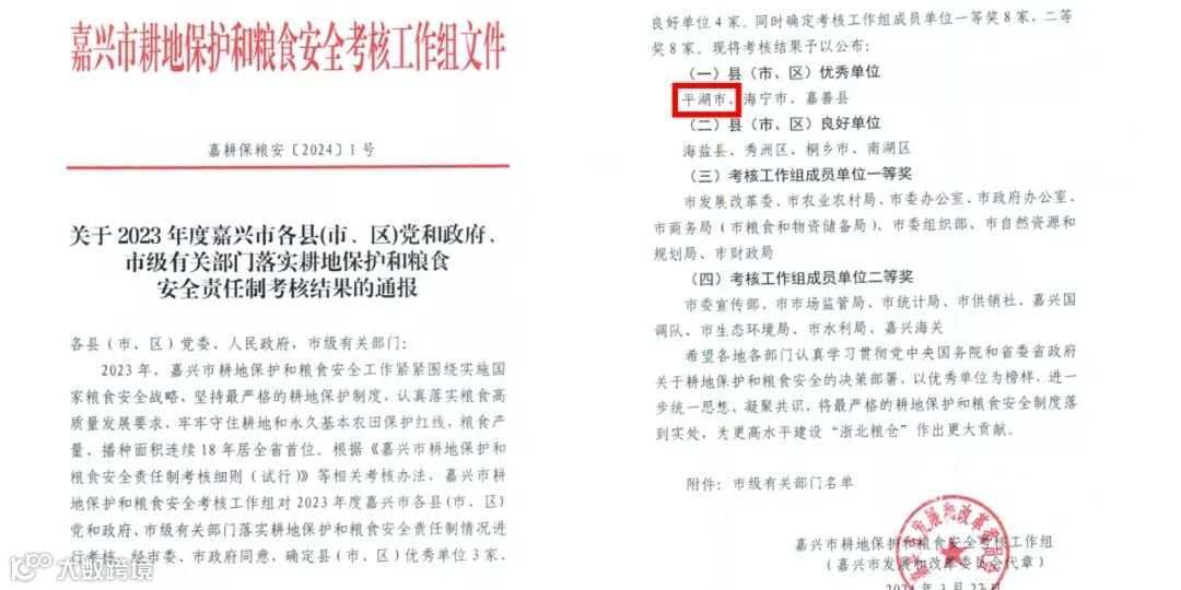2023年,平湖市商务局(粮食物资局)心怀粮食安全“国之大者”,立足粮食和物资储备主责主业,从严落实党政同责,以五大重点工作为抓手,全力推动粮食物资各项工作提质增效,端稳端牢端好平湖饭碗。近日,嘉兴市耕地保护和粮食安全考核工作组公布了2023年度嘉兴市各县(市、区)党和政府、市级有关部门落实耕地保护和粮食安全责任制考核结果,平湖市再获县(市、区)优秀单位,并连续两年蝉联第一名。