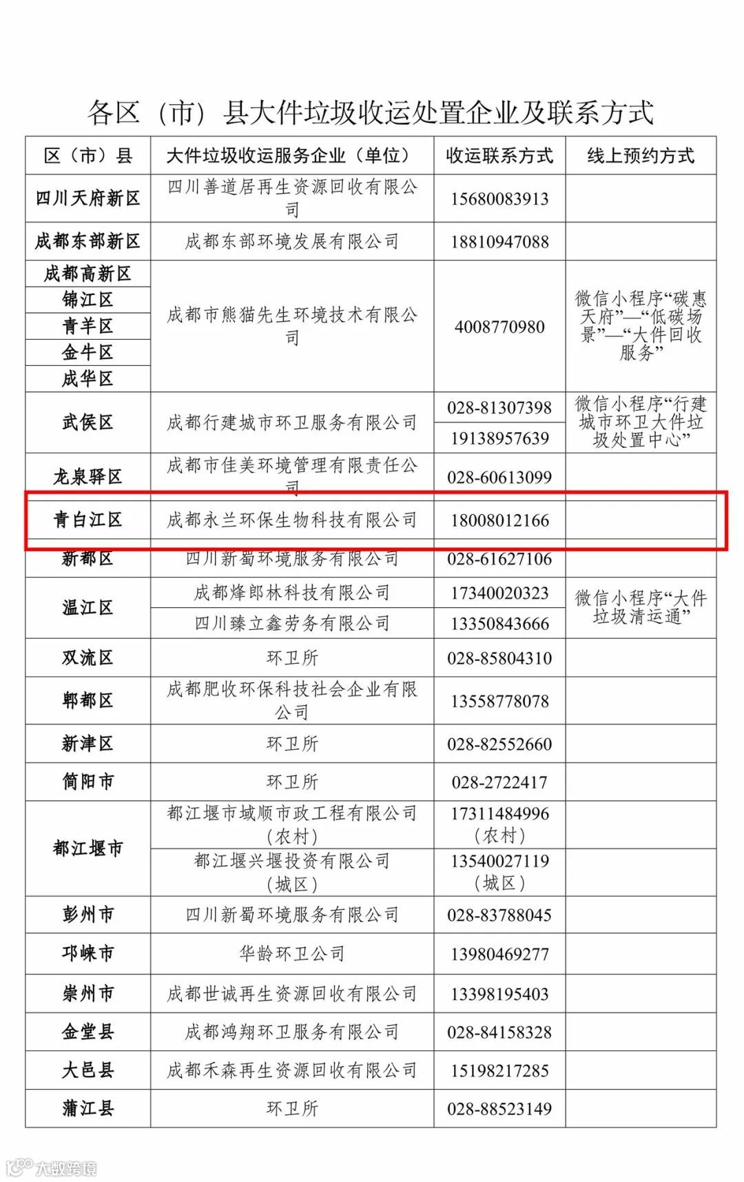 参与方式:市民朋友可将大件生活垃圾送至小区临时堆放点,或社区、街道指定的大件生活垃圾集散点;也可通过扫描“二维码”查找收运企业联系方式,预约上门收运,或通过“天府市民云”手机APP,搜索点击“大件垃圾回收”模块预约下单,由收运企业提供免费收运服务。