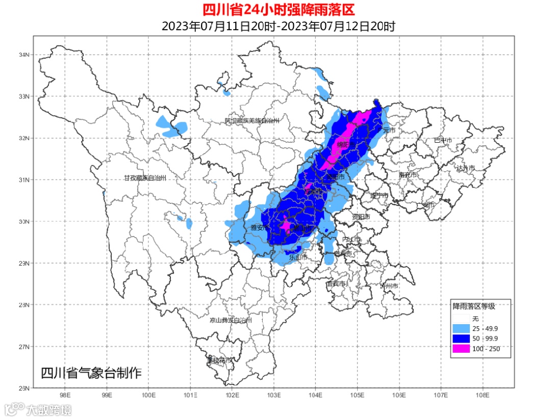 7月11日20时到12日20时:广元、绵阳、德阳、成都、雅安、乐山、眉山7市的部分地方有暴雨(雨量50~80毫米),其中广元、绵阳、德阳、眉山4市西部的部分地方有大暴雨(雨量120~150毫米,个别地方可达200毫米以上),最大小时雨量50~80毫米,另甘孜州东南部有大雨(雨量25~40毫米)。