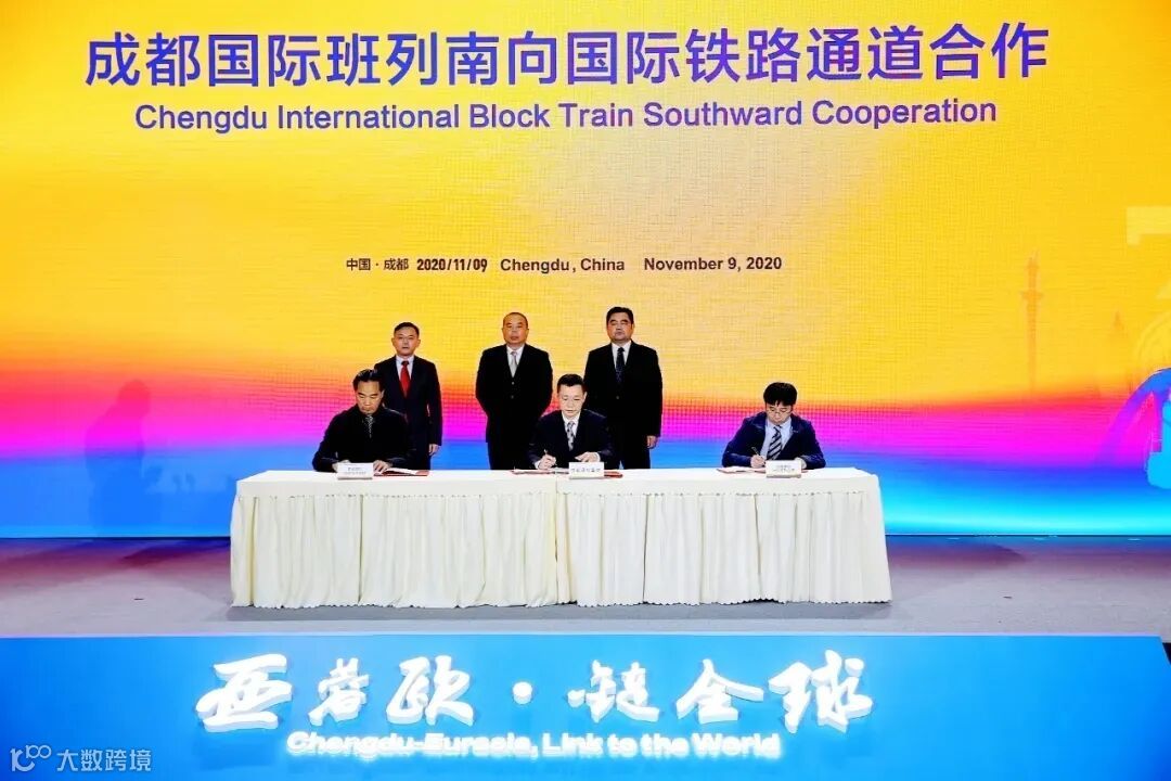在2020年11月9日的举行的第三届“亚蓉欧”全球合作伙伴大会上,成都国际铁路港投资发展有限公司、云南洲际班列物流有限责任公司、老挝磨丁经济专区开发集团有限公司三方携手,签订战略合作协议:共同建设南向铁路联运通道,打造联通内陆、辐射南亚、东南亚的开放物流通道,促进四川、老挝、缅甸经贸往来。未来,三方还将进一步构建一体化多式联运信息平台,支持和推动物流信息系统对接,实现铁路全程维护和查询等服务功能,加速一体化发展。