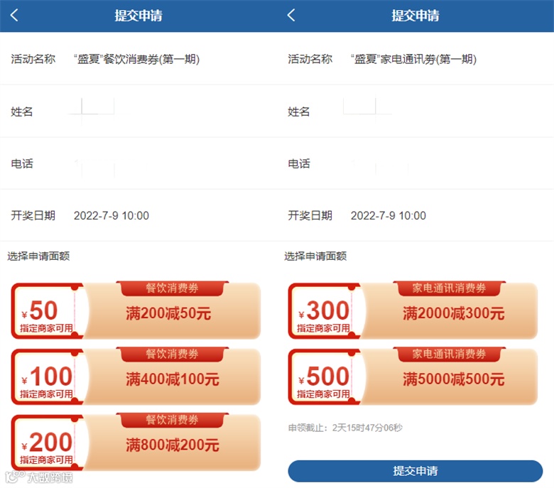填写姓名,并按照自身需求选择申请消费券的面额后,提交申请即可(每人可预约两种面额的消费券,但每种类型消费券最多可获取一张)