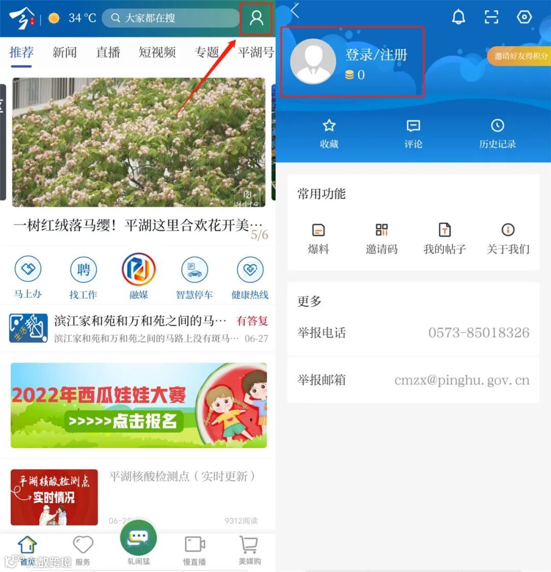 打开“今平湖”APP,点击首页右上角“人形”图标,注册并登录APP账户