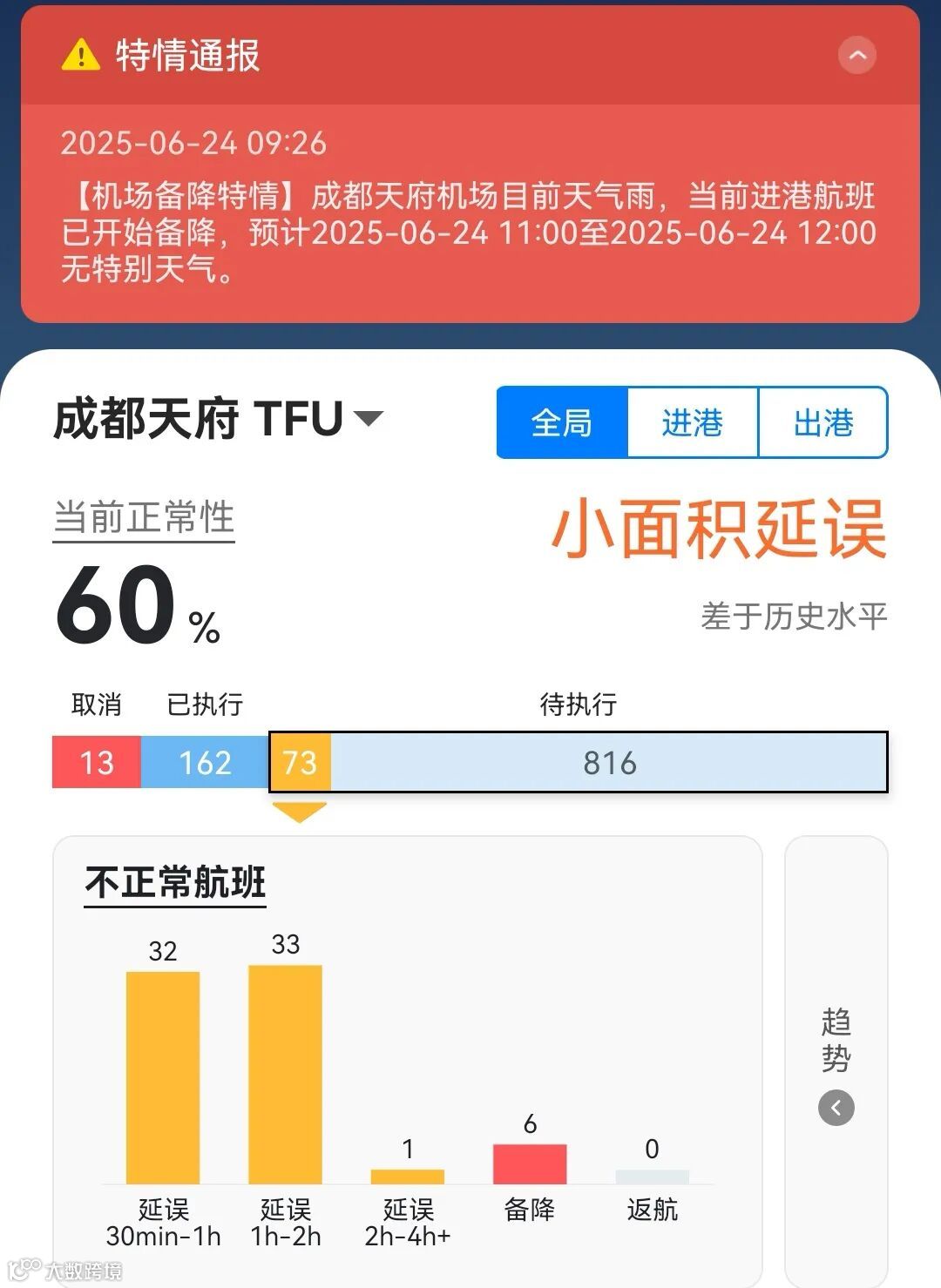 截至24日上午10时,天府机场的航班正常率为60%,有小面积航班延误。其中6个进港航班出现备降,分别来自长沙、杭州、广州、昆明等地至成都天府国际机场航班。