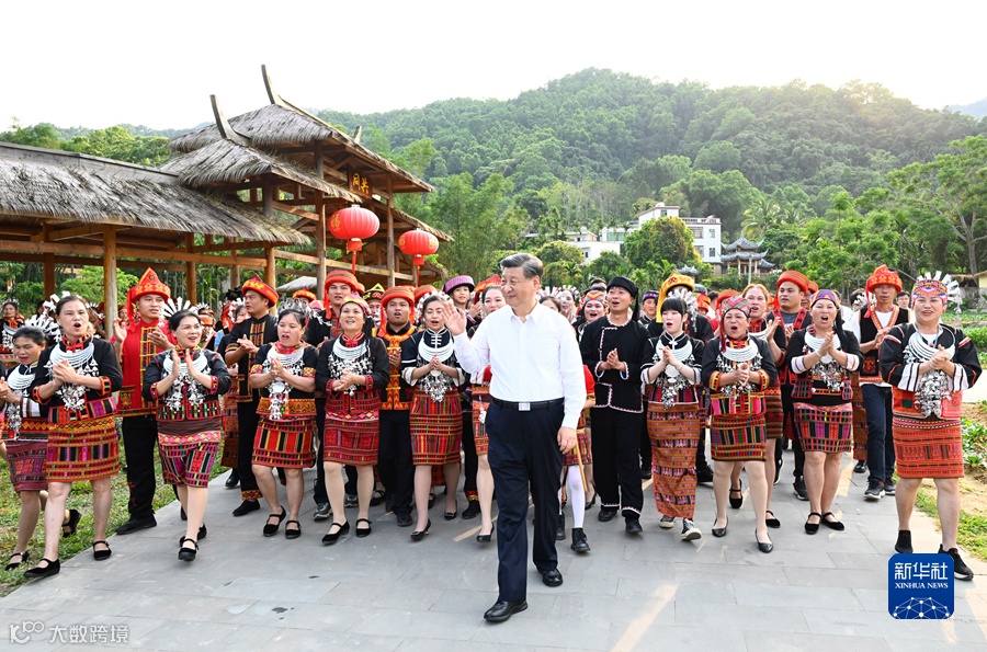 习近平沿长廊察看黎族特色农产品和黎锦、藤编等非物质文化遗产展示。广场上,歌声悠扬、鼓乐齐奏,村民们跳起竹竿舞迎接远方的客人。习近平亲切地对大家说,很高兴来看望黎族乡亲们,看到你们过上幸福生活,我感到很欣慰。我们全面建成小康社会以后,还要继续奔向全体人民共同富裕,建设社会主义现代化国家。乡村振兴要在产业生态化和生态产业化上下功夫,继续做强做大有机农产品生产、乡村旅游、休闲农业等产业,搞好非物质文化遗产传承,推动巩固拓展脱贫攻坚成果同乡村全面振兴有效衔接。各级领导干部要贯彻党的群众路线,牢记党的根本宗旨,想群众之所想,急群众之所急,把所有精力都用在让老百姓过好日子上。