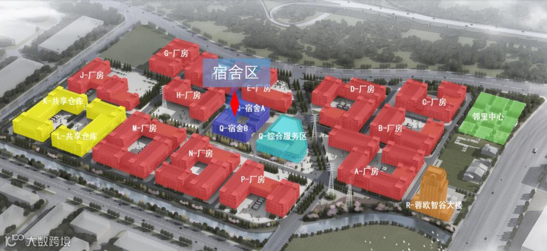 宿舍区位于园区中央,至各生产单元的距离大致相等,实现服务的均等性。规划占地面积4532.66㎡,总建筑面积21321㎡,共5层,分为Q1、Q2两栋建筑。