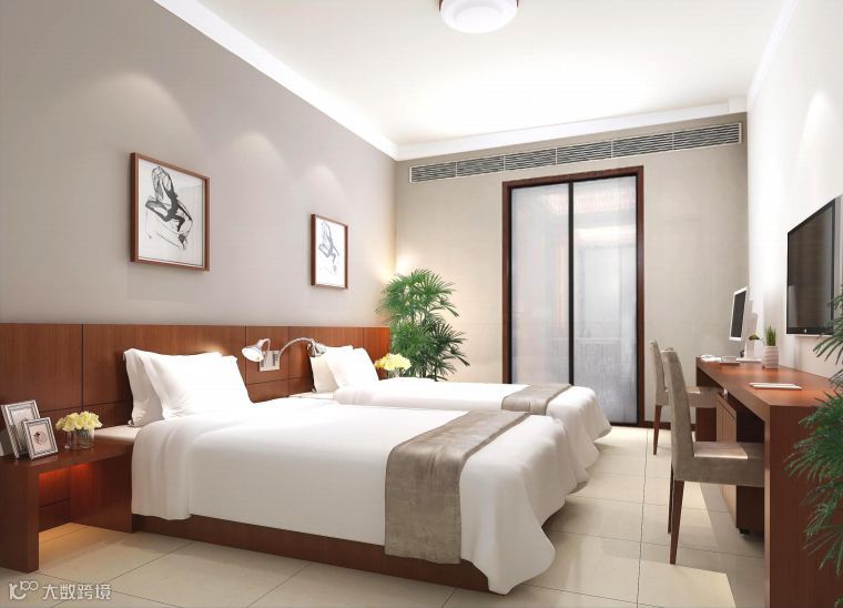 在标间客房设计方案二中,基础家具配置与方案一并无不同。只是将休息区与生活区合并,房间整体更大更宽敞。双人沙发将两人休息区分开,增加距离感,保护隐私,减少相处过程中不必要的尴尬。
