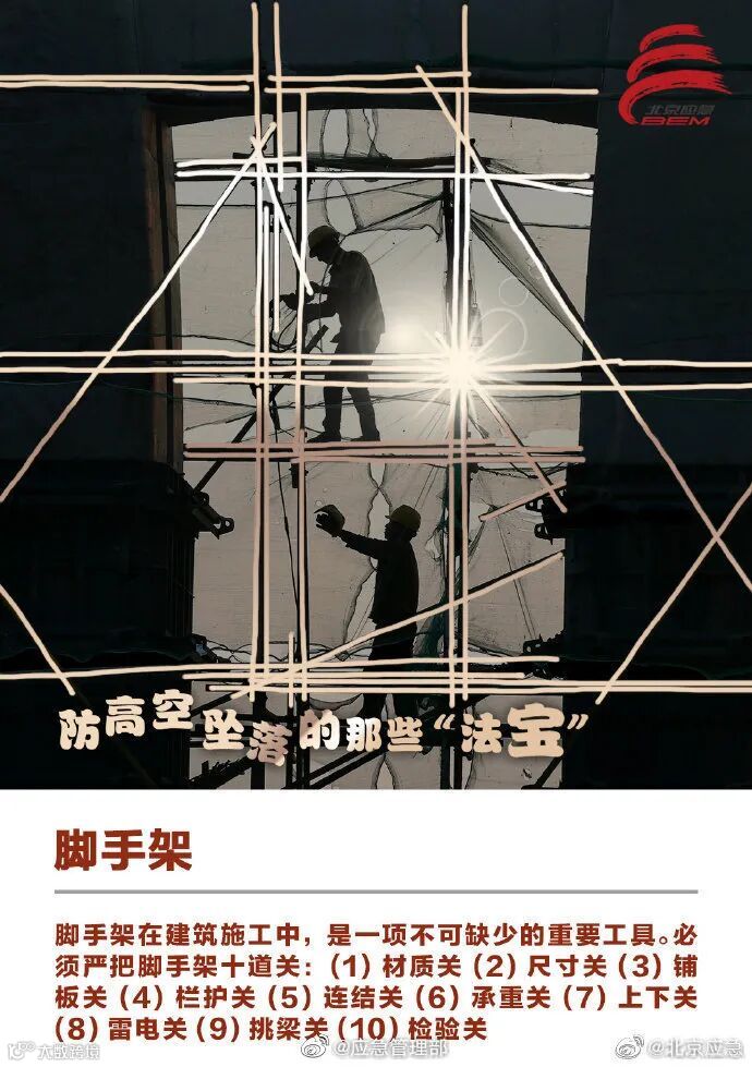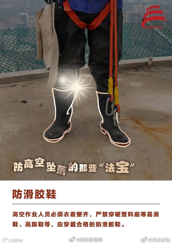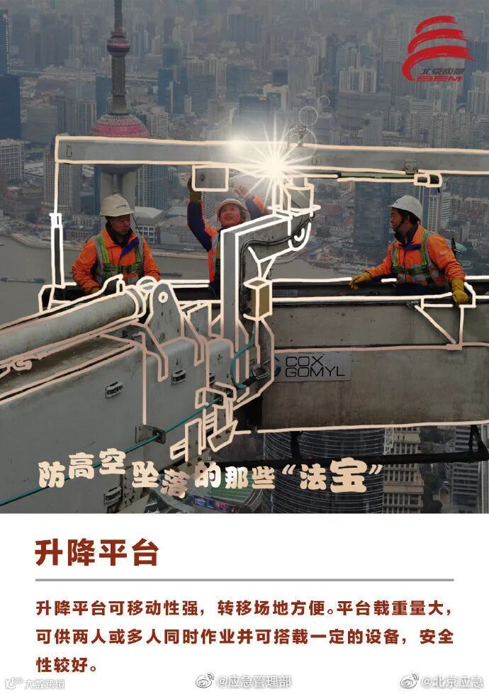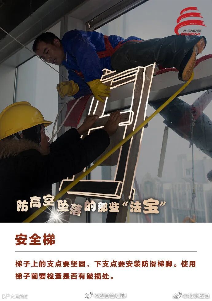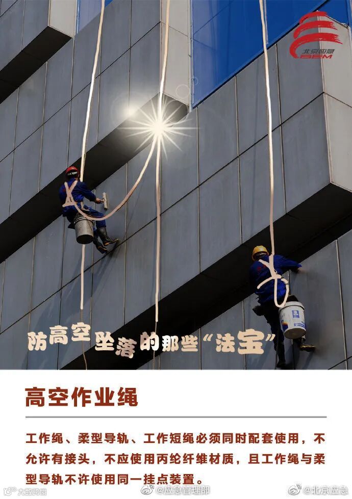 建筑施工领域高处坠落事故易发多发,安全防护工作一定要做好。高空作业时,要确保安全绳索等防护设施和应急装备完好有效、佩戴到位。这些防高空坠落的安全“法宝”请收好↓↓
