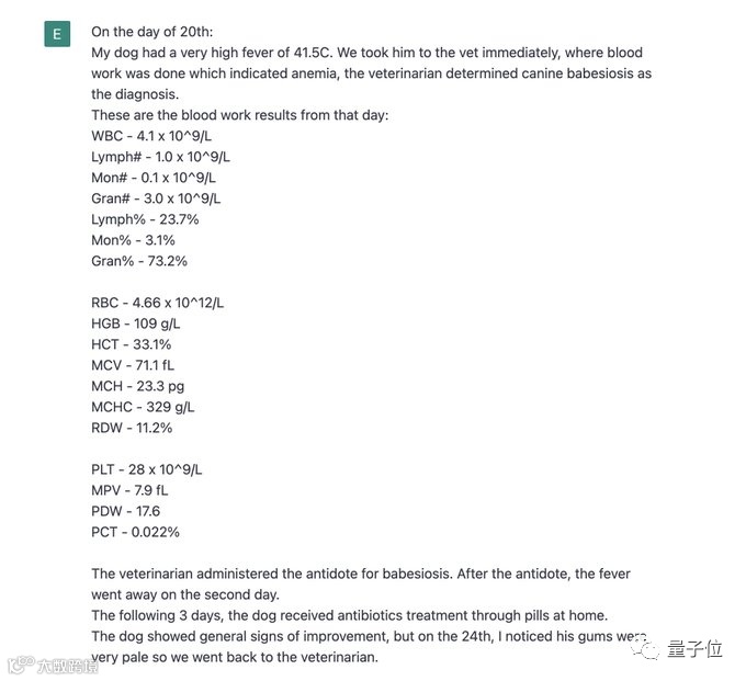 于是说干就干,当天他就将狗子从第一次发病开始的症状、治疗过程以及每次的血液检测报告都一一告诉GPT-4: