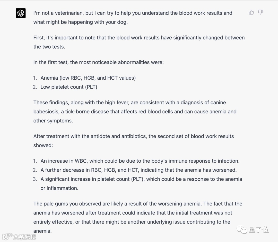 它首先开出了“我不是兽医”的免责声明,然后表示“可以试着帮助你分析血液报告,告诉你的狗可能发生了什么”。