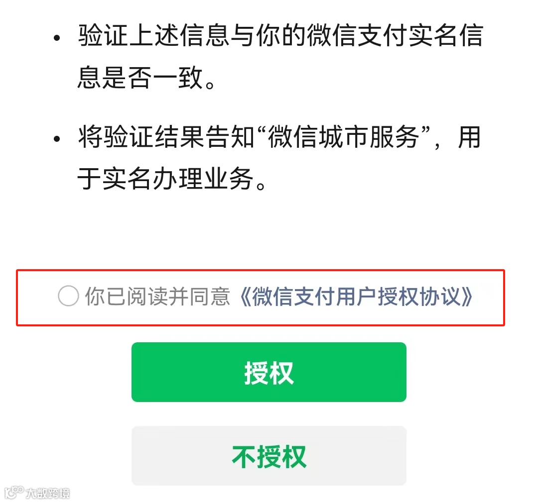 仔细阅读“实名信息验证授权”,勾选“你已阅读并同意《微信支付用户授权协议》”,点击“授权”。