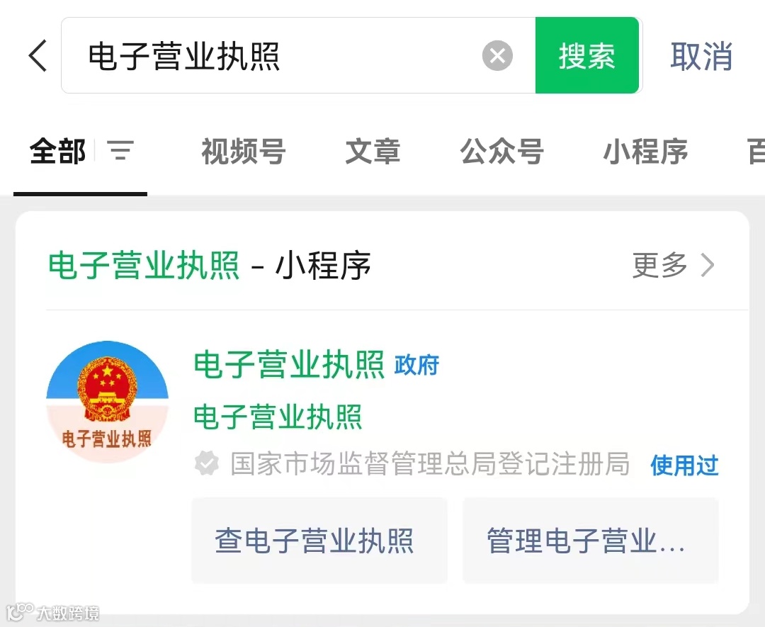 打开微信,在搜索栏输入“电子营业执照”,选择“电子营业执照小程序”,点击图标名称即可进入,弹出“温馨提示”的对话框,请选择下方的“我再看看”。