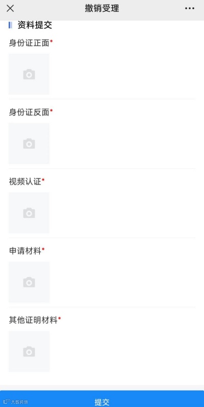 在资料提交界面,提交身份证照片、视频认证、申请表等申请资料。确认无误后点击提交。
