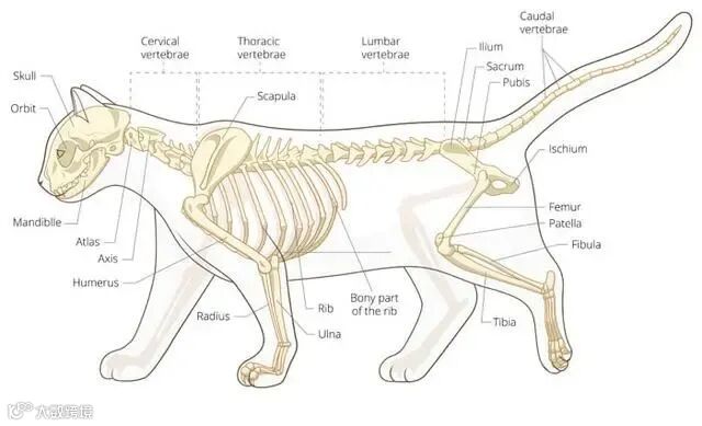 猫的骨头大多狭窄细小,形状仿佛弓箭,但数量众多,能够很好地支撑它们的身体,又能够让它们行动灵活。