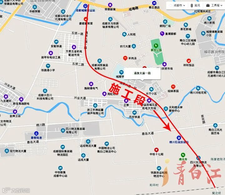 若目的地在清泉镇,则建议由成金青快速通道转其他道路行驶(下图中红色标注路线)。