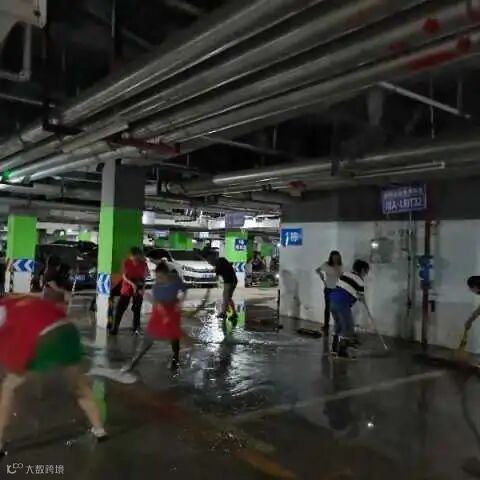 齐心协力排查辖区灾情,挖沟排水,对地下停车场的积水进行清扫。